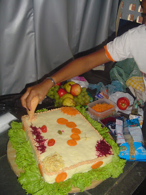 Assim, em sala de aula, os alunos pensaram os primeiros passos, rabiscaram as primeiras idéias e decidiram os nomes dos grupos e de suas obras. Surgiu muita coisa interessante: “A arte de comer arte” (8ª série); “Arte não engorda” (6ª série); “Sentindo o sabor da arte” (7ª série); “Os mestres-cucas da arte” (8ª série); “Olhou? Gostou? Comeu? Quer mais?” (6ªsérie); “Comendo com a arte” (7ª série); “Jogando com a arte” (6ª série); “Arte-fruti” (8ª série); “Salada de Artes” (7ª série); “O gostinho da arte” (7ª série); “Fazendo a comilança” (6ª série); “Comer é bom” (7ª série); entre muitos outros nomes. E como se tratava de uma exposição de arte comestível ligada ao desenvolvimento do Programa “5 ao dia” propus aos alunos que pesquisassem (em casa) receitas em que fossem usadas frutas, legumes, verduras. Não precisava ser radicalmente de acordo com o Programa (que aconselha a comer os alimentos preferencialmente crus). Mas se quisessem uma torta, tinha que ser de fruta ou de legumes ou de alguma verdura; se quisessem um bolo, tinha que ser de cenoura, laranja, ou outra fruta, e o confeito (liberei pro chocolate e algumas coberturas irresistíveis) também tinha que levar ao menos alguma fruta e/ou legumes e/ou verduras. Poderiam completar a “refeição” com sucos de frutas (nem pensar em refrigerante ou sucos artificiais!). Podiam montar esculturas e outras construções espaciais com frutas, legumes, verduras; “pinturas” com verduras picadas, legumes e frutas para o acabamento, e por aí vai. Foram necessárias, para essa fase preparatória, umas três semanas. Marcamos então os dias das apresentações (7ª série, 10/06/2005; 8ª série, 17/06/2005; seguidas das duas 6ª séries, 29/06/2005 e 6/07/2005), que ocorreram no auditório da escola.